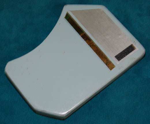 Description: A prop Orion PADD (Personal Access Display Device) featured in various episodes of Star Trek: Enterprise like “Borderland”. The item is asymmetrical molded resin with an inset ‘display screen' featuring a reflective graphical application depicting Orion lettering on a multi-colored scale. The item is painted blue with gray accents and metallic gold and silver colored adhesive details. The item measures approx. 4.75 X 3.5 X .5 inches.