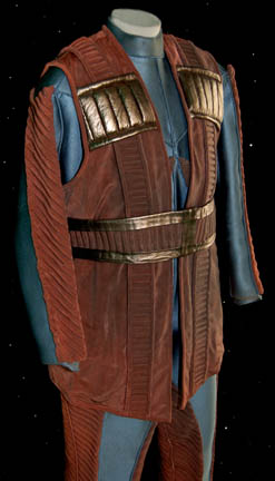 Description: “The Albino” (Bill Bolender) was a notorious criminal who had launched multiple raids on Klingon colonies during the late 23rd Century and featured in the Star Trek: Deep Space Nine episode “Blood Oath”. This costume was made for wear by the “Albino's Assistant” (Christopher Collins); a Markalian who worked on the planet Secarus IV. The costume is a teal neoprene jumpsuit with brown quilted and ribbed sections over the torso, arms and legs. Worn over the jumpsuit is a brown short robe with padded brown and gold colored detail. The corresponding belt is gold colored with a brown quilted center. Costume comes complete with costume tag.