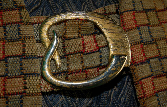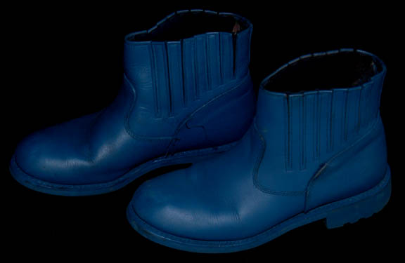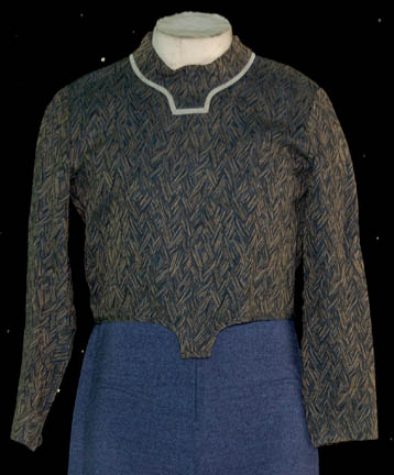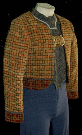 Description: “Rom” (Max Grodénchik) was the younger brother of “Quark” (Armin Shimerman) and the son of “Ishka” (Cecily Adams) during the Deep Space 9 series. Teased his entire childhood because of his smaller than average Ferengi lobes, Rom started his adult career working for poor wages at his brother Quark's bar but managed to work his way up to the superior position of “Grand Nagus” of Ferenginar. This is one of his costumes that includes a blue sleeveless jumpsuit with blue Ferengi-style wings down each leg. Over the jumpsuit is a cropped top made of patterned blue and tan fabric that zips up the back. Two cropped jackets made of earth tone fabric in a checkered design complete the look, each with a gold colored metal buckle at the front. The costume is complete with a matching Ferengi head wrap and blue ankle boots. The inside tags read “Deep Space Nine – Max G”. The costume comes complete with costume tag.