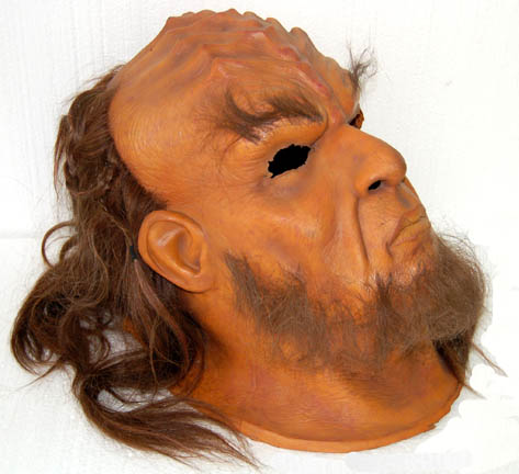Description: This incredible full head Klingon mask was used in Star Trek VI: Undiscovered Country, during a courtroom scene that involved around 200 Klingons. In order to dress that many actors in Klingon makeup, the background actors in the upper balconies wore these full faced masks to make the process quicker than actually attaching individual prosthetics to their faces. This latex head has been completely painted and airbrushed with hair attached behind the forehead ridges. Facial hair has been added for eyebrows and a two part beard. Under the hair at the back of the head is a concealed Velcro strip to allow the wearer to take the mask on and off more easily. Measures approx. 12 x 7 x 11 ½ inches.