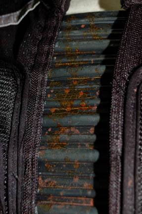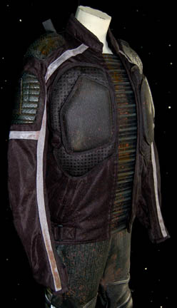 Description: An Osaarian costume made for the Star Trek: Enterprise episode "Anomaly" in which "Enterprise" is attacked by pirates. This exceptional costume is made mostly out of components garnered from motorcycle wear. It features padding in the knees, painted on distress to appear aged, and a cast resin 'transporter' device affixed to the right sleeve by Velcro that lights up in two places when activated by either of its two switches. The costume features name brand labels by 'First Gear'.