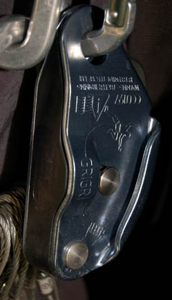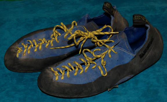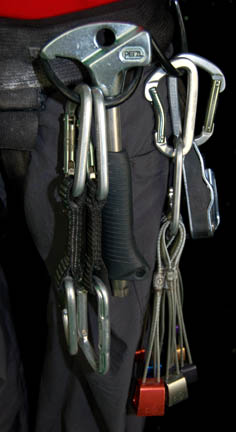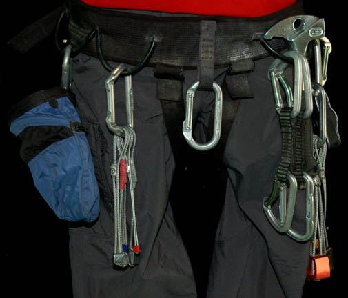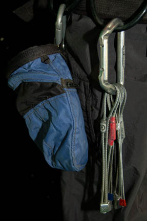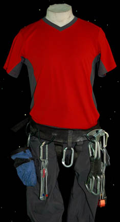 Description: A costume featured in the Star Trek: Enterprise episode “Home”, wherein the “Enterprise NX-01” returns from defeating the Xindi threat and saving Earth from destruction to find much hero worship but also much xenophobia on the rise. This costume is for wear by Scott Bakula in the role of the Cpatain of the “Enterprise NX-01”, “Jonathan Archer”, and is a short-sleeved red shirt with bluish gray accents around the collar and ribs, trousers of a corresponding blue gray color, elastic waistband, two regular trouser type pockets and two zipped. Climbing gear includes a climbing harness with loops and attached carbiners, as well as nuts, and a small bag containing chalk for the climber's grip, a quick draw, “Sportviva” Italian climbing shoes, and a rock axe. A sewn in tag reads ‘Enterprise, Scott Bakula’ and the name “Scott” appears on the climbing harness.