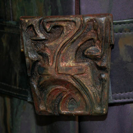 Description: A costume featured in the Star Trek: Enterprise episode “Impulse”, wherein the “Enterprise NX-01” finds a drifting hulk of a Vulcan cruiser than turns out to be not so empty and the Vulcans aboard have been poisoned by the Trellium-D they had been using to line their hulls as proof against the spatial anomalies in the Expanse. The costume is a blackish purple full-length vinyl jumpsuit with matching belt that has been distressed to appear as if the Vulcans wearing them had been stumbling around their ship in a poisoned stupor. A sewn in tag reads ‘Enterprise, Carol Abney, 051'.