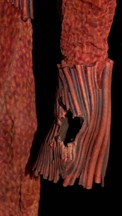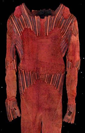 Description: A costume featured in the Star Trek: Enterprise episode “Future Tense”, wherein the “Enterprise NX-01” finds a derelict ship with a human corpse in it that the Suliban and Tellarites seemed to have wanted as well. The Suliban are a nomadic species whose home world had become uninhabitable in the 1850s and began accepting genetic enhancements as payment for various reconnaissance and espionage missions during the Temporal Cold War by mysterious beings from the future. This costume is for wear by Cullen Douglas as the commander of the Suliban ship that lays claim to the derelict ship and is a full-length, long-sleeved rust colored jumpsuit with various rubber accents across the shoulders, around the elbows, cuffs, knees, and waist; thumb holes cut into the cuffs, a neoprene lining sewn in, a zip up the back, flaps over the ankle cuffs that cover up the neoprene shoes. A sewn in tag indicates wear by multiple actors and the costumer's tag reads ‘Enterprise, Suliban, Mike Watson’.