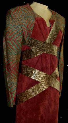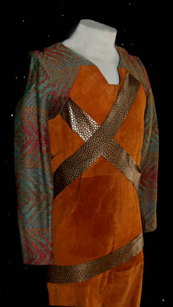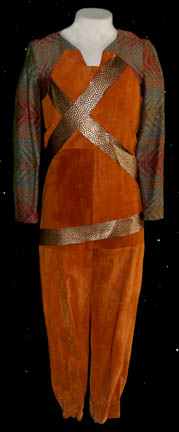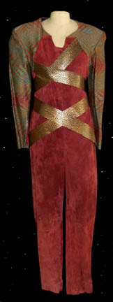 Description: The Promenade on Deep Space Nine is a futuristic mall that serves as the main social location for the station's civilian activities. This Promenade Alien lot includes a male and female jumpsuit. The female jumpsuit is crimson suede with woven multicolored sleeves and shoulders. Two strips of black and gold patterned leather attach on the chest and criss-cross around the body. The male jumpsuit is brown suede with woven multicolored sleeves and shoulders. Two strips of black and gold patterned leather also attach on the chest and criss-cross around the body. Costumes comes complete with costume tag that indicates there are three alien costumes however only two were located in the clothing bag.