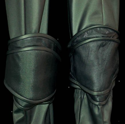 Description: A costume featured in the Star Trek: Enterprise episode “Awakening”, wherein “Captain Archer” (Scott Bakula) and “T'Pol” (Jolene Blalock) encounter a renegade group of Vulcans responsible for the bombing of the Earth Embassy on Vulcan. This costume is for wear by Todd Stashwick in the role of one of the Vulcan Commandos and is a full-length, long-sleeved jumpsuit that is mostly green vinyl but, along the abdomen, is a black spandex-like material, along the sleeves and around the knees the vinyl is reinforced and takes on a textured appearance; there is a zip up the back and stirrups for the feet. Also included is a breastplate of the same reinforced, green vinyl and textured appearance, but also a horizontal ribbed design, buttons and a zip along the left shoulder, and a clasp connection between the legs. A sewn in tag reads ‘Enterprise, Todd Stashwick #84 and the costumer’s tag reads ‘Enterprise, Vulcan Commando, Todd Stashwick’.