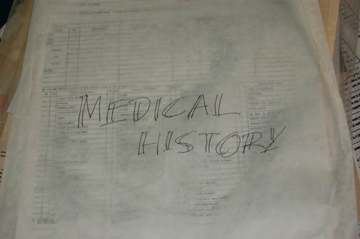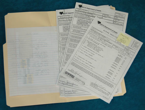 Description: A lot of prop items acquired for use in the Star Trek: Enterprise episode “Carpenter Street” appearing with Leland Orser as “Loomis”, the unscrupulous blood bank worker who aided the time traveling Xindi-Reptilians in their quest to create a biogenic weapon. The lot is a collection of paper files and manila file folders, the papers are photocopies of various medical history charts from the ‘Detroit Department of Health', the folders feature applications indicating blood groupings like ‘B+’, ‘O-’, and all of the others. A sack contains is listed as the masters for the copies and a handwritten sheet is inscribed ‘hero files’. The lot also comes with a pair of glass jars with metal lids, both filled with wads of white fabrics intended to appear on screen as a method for incapacitating “Loomis’” victims. One jar does not appear to open, the other one does and smells vaguely of pickles.