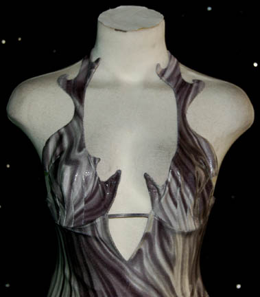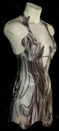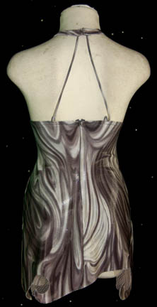 Description: This seductive dress was made for use by a “Farian Call Girl” (Delilah Stombs) in the Star Trek: Deep Space Nine episode “Honor Among Thieves”. She was hired by “Liam Bilby” (Nick Tate) for “Miles O'Brien” (Colm Meany) who had infiltrated the Orion Syndicate for Starfleet Intelligence. The swirling fabric gray and white dress has curls around the bottom and around the straps. There are mesh sections around the bottom and there is a zip up the back. Costume comes complete with costume tag.