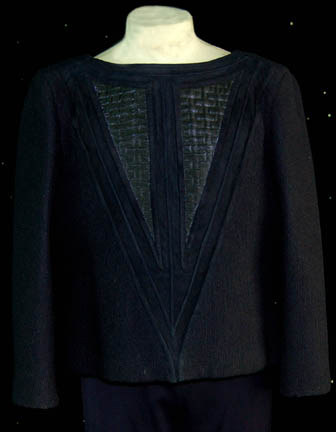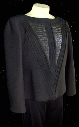 Description: “Thrax” (Kurtwood Smith) was the Cardassian chief security officer assigned to Terok Nor and featured in the Star Trek: Deep Space Nine episode “Things Past”. The jacket is made of neoprene with navy blue ribbed fabric covering the arms and torso. On the front and back are ‘V' formations made of navy suede with quilted centers. There is a zip up the back. The corresponding trousers are navy blue. Costume comes complete with costume tag.