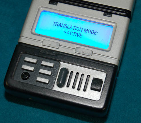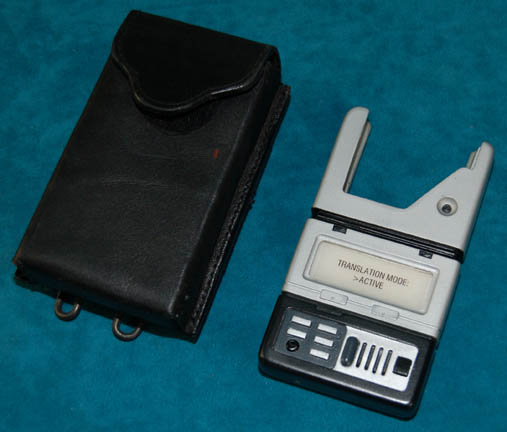 Description: A cast resin hand prop universal translator device featured in various episodes of Star Trek: Enterprise. Painted metallic silver with black accents, this item features a ‘display screen' with a transparent graphic reading ‘Translation Mode: >Active’ which is backlit blue when the button is depressed and powered by four A27 sized 12volt batteries. The battery casing is accessed by pulling the silver and black sections away from one another carefully. The item is made to have a Starfleet communicator (sold separately) fit down into the placement at the top and measures approx. 4.25 X 2.6 X .6 inches. The item is accompanied by a custom made black leather belt case with a Velcro seal flap and a military style clasp on the reverse.