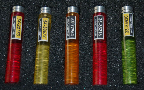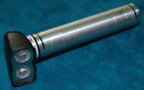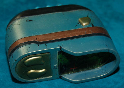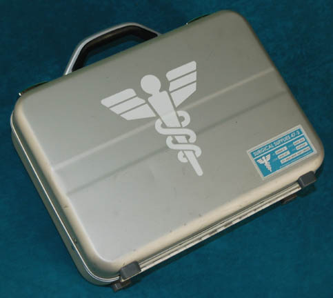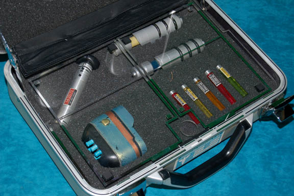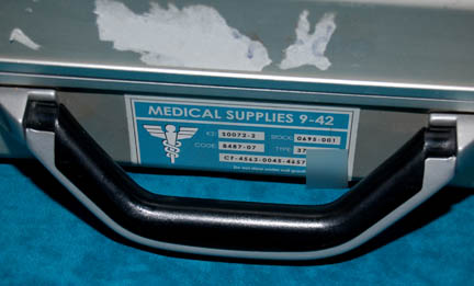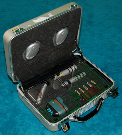 Description: Perhaps one of the most complete prop items available, this lot is a silver colored metal case, a hinged lit and two sturdy latches, with a handle. When opened, the custom gray foam interior holds in place a variety of props featured in various episodes of Star Trek: Enterprise. The case contains a pair of metallic silver painted plastic defibrillators which feature a pair of strobeing red lights on each activated by a depression button on the top and powered by a 9volt battery each (not included). A clear acrylic shield within the case may be pulled up to allow access to a molded foam rubber scanner painted metallic green with a copper colored strip and black accents, five multi-colored solid acrylic vials with metal ‘caps' and Starfleet inventory labels on each, a pair of silver colored molded rubber hyposprays with black accents and differing colored injectors, and a silver colored metal scanner with a black emitter that features a pair of lights colored blue and red, both of which are activated by a button each and can be used simultaneously, powered by an unknown source but with power remaining from production use. The item features a Starfleet inventory label, the exterior of the case features blue medical supply applications with a white cadesus inscribed ‘Medical Supplies’. A large white cadesus is applied to both sides of the case and measures approx. 11.5 X 14.25 X 4.5 inches.