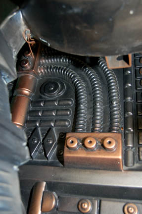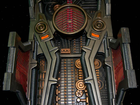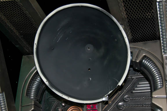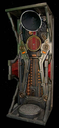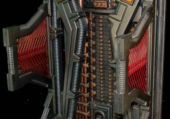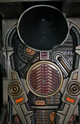 Description: A large, full sized Borg alcove created for either exposition or on screen use. The item is a steel framed Borg Alcove with wood backed vacuum formed accents painted a variety of metallic colors, with an attached housing for a plasma disk at the top, and a sturdy plastic grate stand at the bottom. The alcove is freestanding on its steel frame, the base features a wire mesh around the standing grate, the back is adorned with a full length vacuum form, the center features vacuum forms backed by cut wood, and the sides are also covered by vacuum forms. This style of alcove became prevalent during Star Trek VIII: First Contact and continued to be used through most of Star Trek: Voyager. The item measures approx. 36 X 95.5 X 32 inches.