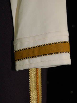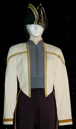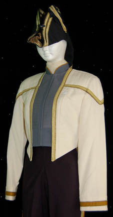 Description: A costume first appearing in Star Trek IX: Insurrection, later in episodes of Star Trek: Deep Space Nine, and finally during the wedding scenes in Star Trek X: Nemesis. The costume is a full length sleeveless black jumpsuit with gold colored piping running down the outside seams of the legs and a cropped white uniform jacket with a gray quilted center zip front bordered by gold piping traveling around the neck and bracketed by quilted white shoulders and more piping around the chest. Operations gold division trim is bordered by gold piping around the cuffs and the jacket features a white Velcro placement for a Starfleet combadge (sold separately).