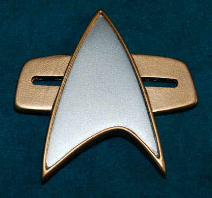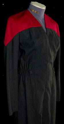 Description: “Dala” (Kaitlin Hopkins) was an alien con artist who impersonated “Captain Janeway” (Kate Mulgrew) in the Star Trek: Voyager episode “Live Fast and Prosper” in order to obtain different goods by offering services she and her partners didn't deliver. The Starfleet jumpsuit is dark gray with Command red shoulders, a built in gray dickie and a zip up the front. There is an internal adjustable waistband and loops around the waist. An oversized resin Combadge and four oversized captain’s rank pips are also included. Costume comes complete with costume tag.