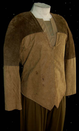 Description: A costume featured in the two part Star Trek: The Next Generation episode “The Gambit: Part I and II”, wherein “Captain Picard” (Patrick Stweart) is presumed dead and the crew of the “Enterprise-D” pursues those they think responsible when “Captain Picard” is actually in disguise and investigating these mercenaries' mission to find an ancient Vulcan artifact on the very ship being chased. This costume is a tan, long-sleeved tunic, pleated, olive colored trousers, and a two-toned, long-sleeved, leather jacket with a dotted pattern along the lower third of the abdomen and lower half of the sleeves, a zip down the front that tucks into the trousers, and has been very simply distressed for appearance. The costumer’s tag reads ‘256 & 257 Gambit pt 1 & 2, Stunt Picard, John Nowak’, whereas the trousers actually belonged to Patrick Stewart, were found separately of the rest of the costume, and have their own costumer’s tag that reads ‘Star Trek – next gen, Picard, Patrick Stewart’.