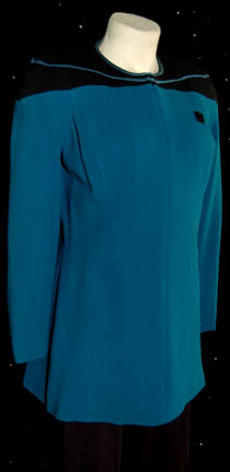 Description: A costume featured in various episodes of Star Trek: The Next Generation, during the second season, when “Dr. Beverly Crusher” (Gates McFadden) left the “Enterprise-D” to head Starfleet Medical and “Dr. Katherine Pulaski” (Diana Muldaur) replaced her. The uniform is a 24th century Starfleet tunic in science or medical division blue, a Velcro patch on the left breast for a commbadge (not included), zipped pockets on either side of the stomach, a full-length, sleeveless jumpsuit that functioned more as an undergarment above the waist and the standard jumpsuit below, with stirrups for the feet and a zip down the front. The costumer's tag reads ‘TNG #133 Unnatural Selection, Pulaski/Diana Muldaur’