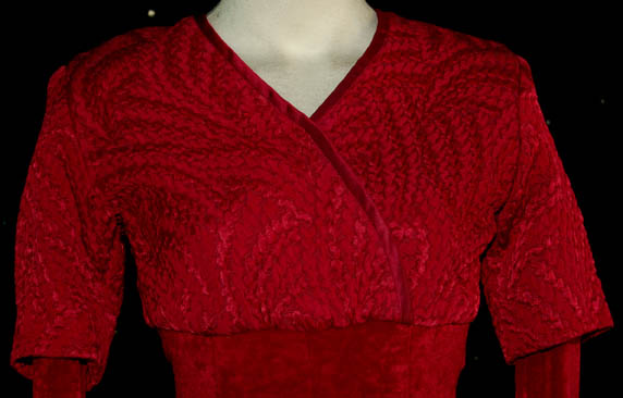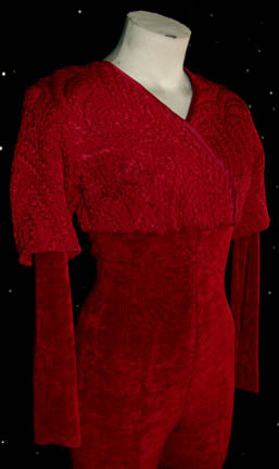 Description: “Kes” (Jennifer Lien) was from the Ocampa species who was rescued by “Neelix” (Ethan Phillips) and bought onboard the U.S.S. Voyager. She started off growing fruits and vegetables in a hydroponics garden in one of the cargo bays then later studied to become a nurse in sickbay. This pair of crimson jumpsuits was made for wear by Kes during the Star Trek: Voyager series. Each jumpsuit is double layered with a textured top section and a zip up the back. They have short sleeves with long sleeve extensions. Each jumpsuit has a sewn in tag that reads “Voyager – Jennifer Lien”. Costumes come complete with costume tag.
