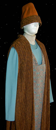 Description: A Vhnori attendant costume from the Star Trek: Voyager episode “Emanations” in which “Harry Kim” (Garrett Wang) was trapped on the Vhnori homeworld while investigating mineral deposits on an asteroid. The costume includes a pale teal spandex jumpsuit with long sleeves and a triple layered over dress with thick straps. The top layer of the over dress is heavy lace and the bottom two layers are two types of teal colored fabric with pleats. It fastens at the front with snaps. Worn over the top is a sleeveless full length pleated mustard and black robe. The corresponding hat is formed tan felt with a pleated mustard and black rim. Costume comes complete with costume tag.