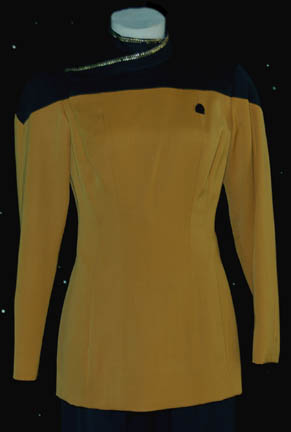 Description: “B'Elanna Torres” (Roxann Dawson), half-human and half-Klingon, was Chief Engineer onboard the U.S.S. Voyager during the Star Trek: Voyager series. This Starfleet dress uniform was made for wear during the show and was featured in the Star Trek: Voyager episode “One Small Step” in which the crew of the U.S.S. Voyager paid tribute to “John Kelly” (Phil Morris). He was the pilot of the ‘Ares IV’; the first manned spaceship to Mars. Torres’ dress uniform includes an Operations gold jacket with black shoulders and a discreet zip up the front. There is gold colored trim around the collar however due to time and use small bits are missing. A Velcro patch is on the left breast for a Combadge (not included) to attach. The corresponding trousers are black and the two accompanying sleeveless under-leotards are gray. Also included is a metal Maquis rank bar that may not be Torres’ however it is her rank. It has small holes at each end for sewing onto the costume. Costume comes complete with costume tag.