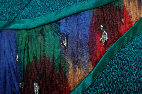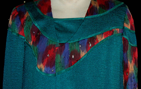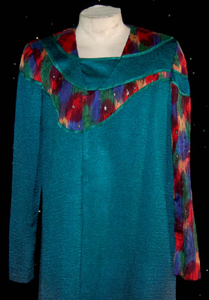 Description: “Gathorel Labin” (Ronald Guttman) was a Sikarian magistrate featured in the Star Trek: Voyager episode “Prime Factors”. He invited the crew of the U.S.S. Voyager to his home planet where they discovered his race had advanced technology that could fold space and make it possible to travel thousands of light-years in seconds. Although this would help the Voyager get home quicker, Labin was unable to give “Captain Janeway” (Kate Mulgrew) the technology since his race was prevented from disclosing advanced technology to less advanced races. The tunic is teal with ruffled multicolored sections around the shoulders and left arm. Within the multicolored sections is silver glitter detail. The tunic fastens with snaps up the front. The corresponding trousers are also teal. Costume comes complete with costume tag.