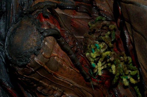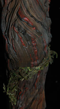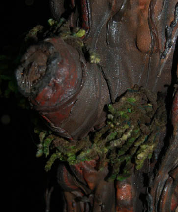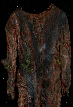 Description: “Trevis” (Justin Louis) was a holodeck fairytale character that “Neelix” (Ethan Phillips) created for “Naomi Wildman” (Scarlett Pomers) while they waited for word on whether her mother was safe after she crashed in a shuttle in the Star Trek: Voyager episode “Once Upon A Time”. This impressive costume is a brown spandex jumpsuit with padded areas to give a lumpy appearance. It is painted in earth-tone colors and dripped all over with latex to give the impression of a tree trunk. Green wool is attached in tufts to resemble moss. The suit has built-in feet and a zip up the back. Costume comes complete with costume tag.