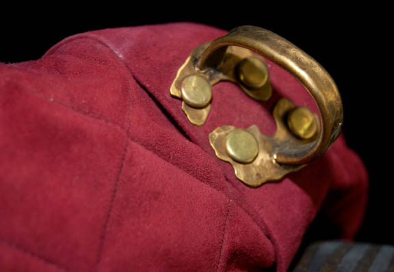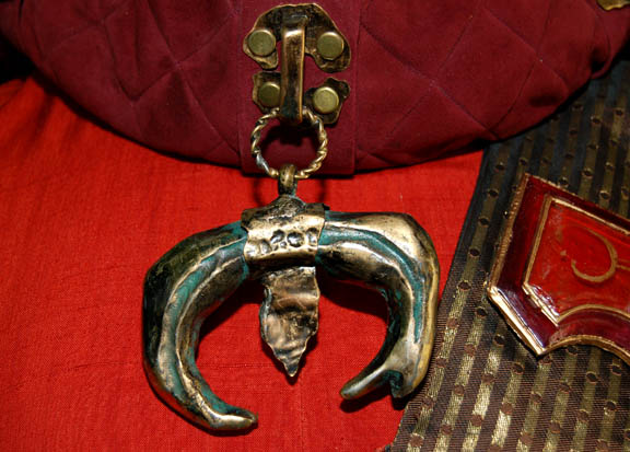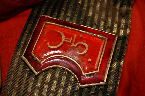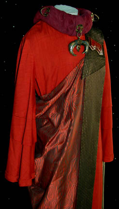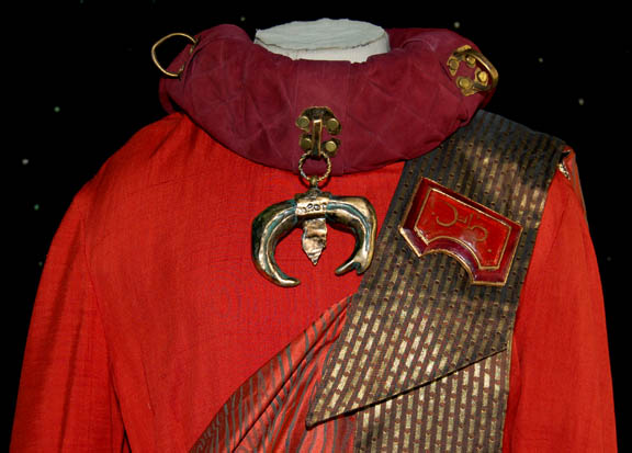 Description: This impressive costume was made for wear by the “Vulcan Master” (Joseph Ruskin) in the Star Trek: Voyager episode “Gravity”. A young “Tuvok” (Tim Russ) was sent to the master who taught him how to control his emotions and embrace logic. The terracotta colored robe has pleated sleeves, a zip up the front and padded collar that fastens with a snap in the front. Worn over the robe is a terracotta colored sash with brown circular patterns and gold fabric lining. A brown and gold colored sash is attached at the shoulder that hangs freely down the back but is incorporated into the sash at the front. Attached on the shoulder is a resin Vulcan piece of jewelry. Around the neck is a padded burgundy collar with an internal wire structure for it to hold its shape. There are four metal loops around the edge, two of which have substantial metal decorations hanging from them. The collar fastens with lacing in the back. Costume comes complete with costume tag.