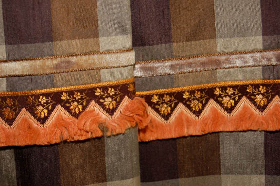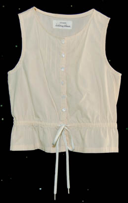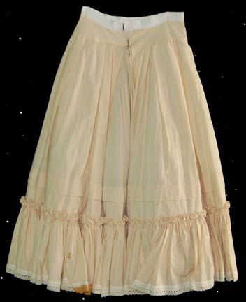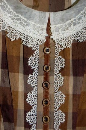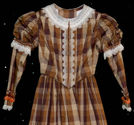 Description: “Lady Beatrice Burleigh” (Lindsey Haun) was the daughter of “Lord Burleigh” (Michael Cumpsty) and featured in the Star Trek: Voyager episode “Learning Curve”. She and her father were characters in “Captain Janeway's” (Kate Mulgrew) holodeck program ‘Janeway Lambda one’. This adorable period dress is brown check with cream lace around the collar, sleeves and down the front. An orange fringe trim is also around the cuffs and bottom of the dress. The dress fastens up the back with hooks and eyes. Worn underneath is a multilayered petticoat to give the dress a full appearance. Costume comes complete with costume tag.
