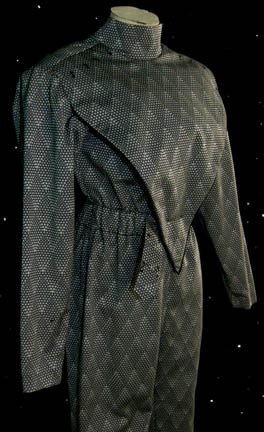 Description: A costume featured in the Star Trek: The Next Generation episode, “The Emissary”, wherein the “Enterprise-D” has to intercept a Klingon Battle Cruiser whose occupants have been in suspended animation and still believe that they are at war with the Federation. This costume is for wear by Suzie Plakson as the special Klingon Emissary sent to the assist the “Enterprise-D” in its interception of the Klingon ship, “K'Ehleyr”, and is a long-sleeved, full-length, metallic-gray jumpsuit featuring a diamond pattern of white dots, a triangular flap with black piping, metal accents along the shoulders and waist (included but not attached), and stirrups for the feet. The costumer’s tag reads ‘#146 The Emissary, K’ehleyr, Suzie Plakson’.