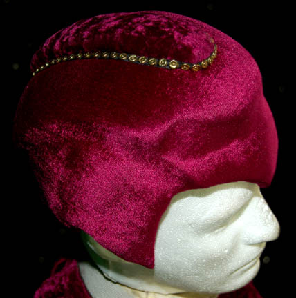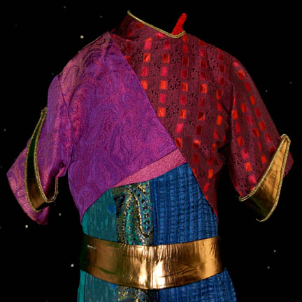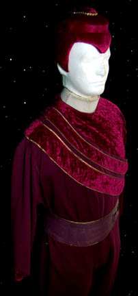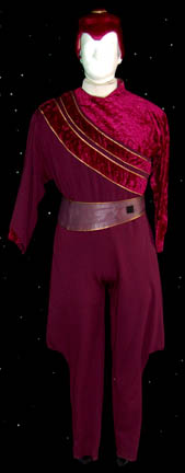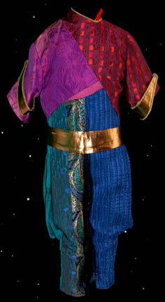 Description: A costume featured in the Star Trek: The Next Generation episode “The Most Toys”, wherein a devious trader fakes “Commander Data's” (Brent Spiner) death so that he can be added to his collection of “antiquities”. This costume is for wear by Saul Rubinek in the role of the pernicious trader “Kivas Fajo”, and is a long-sleeved, leg-less, leotard that is half purple velvet and half a stretchy purple fabric with gold trim around the collar, and decorative sewn cuffs. Also included is a purple jumpsuit that fits over the leotard with corresponding purple velvet and gold trim stripes that go diagonally down from the right shoulder, equestrian style trousers, matching purple/gold leather belt, a zip down the back, and stirrups for the feet; an interesting hat made of latex with purple velveteen fabric, darker purple velvet, and gold colored accents. British actor and little person David Rappaport was the original choice for this role but sadly, he committed suicide after filming only a few scenes. His costume is full-length, long-sleeved jumpsuit made from six different fabrics in individual designs, stitched together in patchwork fashion, a blue leather belt with gold trim, zips down the top and bottom, and zip cuff adjustment around the ankles; a vest of still two more different designs in patched together in the same way, and oversized, gold cuffs.