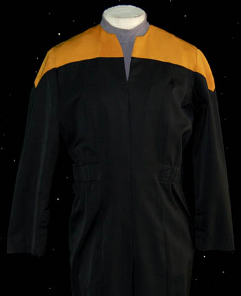 Description: “Harry Kim” (Garrett Wang) was the Operations Manager onboard the U.S.S. Voyager during the Star Trek: Voyager series. This Starfleet uniform was made for wear by Harry on the show. It includes a black jumpsuit with operations gold shoulders and a small Velcro patch for a combadge (not included) to attach. There is a zip up the front, internal waist adjuster, Velcro at the cuffs and loops around the waist for away tools (not included) to attach. The gray short sleeved undergarment has built-in shorts, built-in armpit sweat protectors and a zip up the back. The sewn in tag in each piece reads “Voyager – Garrett Wang”.