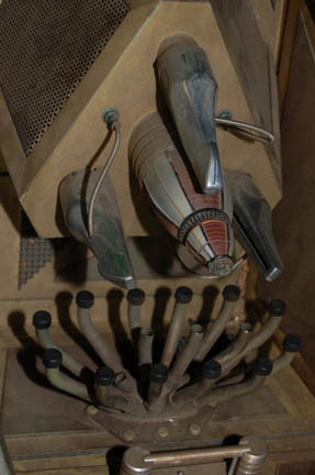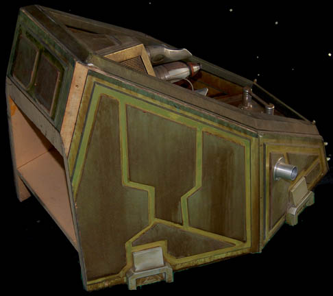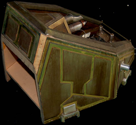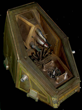 Description: A prop item from the Star Trek: Voyager series finale “Endgame” where it appeared as a time travel device acquired by “Admiral Janeway” (Kate Mulgrew) in the alternate future in which the Voyager crew made it to Earth in thirty years as opposed to the seven which only took place due to her temporal tampering. The item appeared again in the Star Trek: Enterprise episode “Precious Cargo” where it was used as an engine element on an alien ship under repair by “Commander Tucker” (Connor Trinneer). The piece is made of wood with vacuum formed plastic and metal components painted aged green and gold. Measures approx. 34 x 24 x 21 inches.