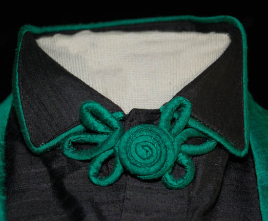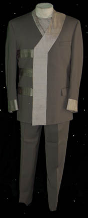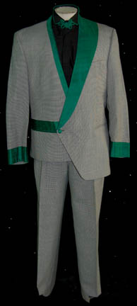 Description: A costume featured in Star Trek VI: The Undiscovered Country for wear by a ‘munitions dealer'. The lot is composed of two costumes, both changes for the character portrayed by Carlos Cesteros. Change number one is a gray colored suit with trousers, a long sleeved tee-shirt with snaps for the attachment of a pleated dickie, and a gray double breasted jacket with silver colored accents, faux and functional pockets. Change number 2 is a pair of black button front long sleeved shirts with green piping around the collar and an oriental style bow at the neck, and a hound’s tooth jacket with green collar accents and cuffs, with multiple interior pockets and one on the front with matching trousers, sans green accents. The costumer’s tags read ‘Munitions Man, Carlos Cesteros, Ch#1, Sc., with black StarFleet zipper boots, S.T. VII’, though no boots are present, and ‘Star Trek VI, Carlos Cesteros, Munition’s Salesman, Change 2, Khitomer Conference, with black Starfleet style boots’, though no boots are present.