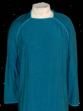 Description: A Starfleet sickbay costume used in a reoccurring capacity during the Star Trek: Voyager series. The sewn in tags in the blue gown read “Voyager – Ethan Phillips” (Neelix), “Voyager – Garrett Wang” (Harry Kim) and a third background actor's tag. It was presumably worn by Neelix in the Star Trek: Voyager episode “Phage” in which his lungs were removed by an alien species. The corresponding trousers are also blue and the sewn in tags read “Voyager – Tim Russ” (Tuvok), “Voyager – Garrett Wang” (Harry Kim) and two more tags with background actors names. The trousers were presumably worn by Tuvok in the Star Trek: Voyager episode “Riddles” in which Tuvok lost his memory when he was attacked by aliens.