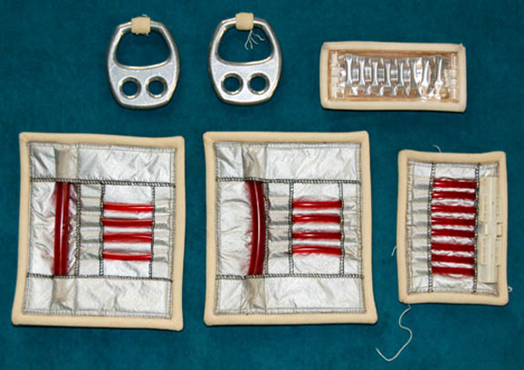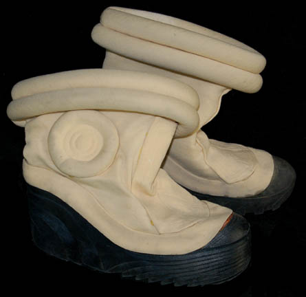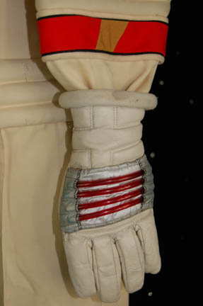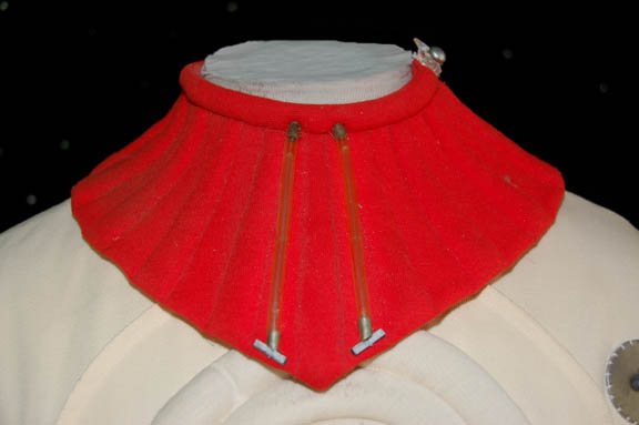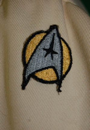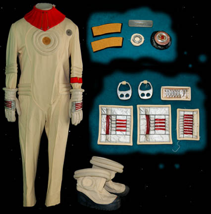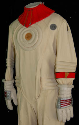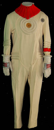 Description: A white engineering radiological trainee costume the style of which first appeared in Star Trek II: The Wrath of Khan and continued use through Star Trek VI: The Undiscovered Country. The costume is a full length white jumpsuit with a ribbed waist and elbows, a ribbed circle centerpiece, an affixed metal breath mask attachment on the left breast, an affixed yellow backed Starfleet emblem patch indicating the wearer to be part of the engineering division, and an affixed red division strip around the left forearm sleeve with a yellow flash indicating an intention to be in the engineering division. The costume also comes with matching boots with large black soles and gloves with red ‘thermal' tubing accents, two unattached leg ‘thermal’ units with red tubing and one for the arm, an unattached silver waist accent, a red ribbed collar with tubing accents, Velcro and snaps, an unattached foil and copper colored center chest placement, unattached yellow shoulder division strips, an unattached white placement with an affixed metal badge indicating the wearer to be a ‘petty officer 1st class’ rank, and a silver colored pin backed name plate reading ‘STRATH’. The costume also comes with a pair of unattached silver colored metal rigging loops for the front of the costume. The costume features two sewn in Paramount tags, one with a name.