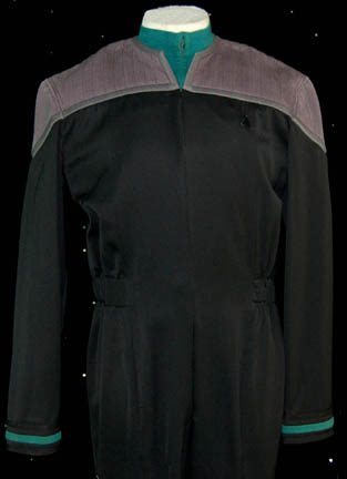Description: A Starfleet uniform in the style that made its first appearance in Star Trek VIII: First Contact comprised of a full-length black jumpsuit with gray quilted shoulders. The jumpsuit features black elastic stirrups at the feet, a form fitting elastic waistband sewn inside with attached loops for ‘away team' gear, a Velcro patch on the left breast for a combadge (sold separately), and a sciences blue division stripe at the cuff. The uniform zips up the front and comes complete with a separate long sleeved undershirt matching the division cuff color that zips up the front. Uniforms like this were also seen in Star Trek: Deep Space Nine after the episode “Rapture”, in late seasons of Star Trek: Voyager, and in Star Trek IX: Insurrection and Star Trek X: Nemesis. The costumes were worn by various actors as indicated by the sewn in ‘MUTO Little, Los Angeles’ tag inside.