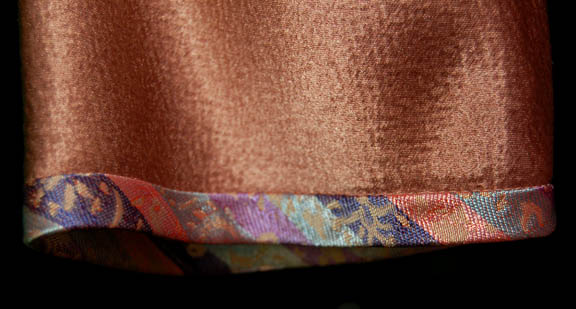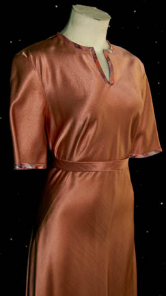 Description: A costume featured in the Star Trek: The Next Generation episode “A Matter of Perspective”, wherein “Commander Riker” (Jonathan Frakes) is accused of murder and the trial takes place on the holodeck. This costume is for wear by Gina Hecht who played,” Manua Apgar”, the wife of a prominent scientist and later accused “Commander Riker” of his murder when he mysteriously died; it is a full-length, short-sleeved, brown/pink hammered silk dress, multicolored floral print accents around the collar and sleeves, a matching belt, silts up the side and a zip down the back. The costumer's tag reads ‘162 The Matter of Perspective, Manua, Gina Hecht’.