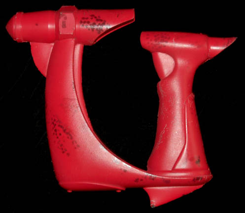 Description: The Son'a are a humanoid race descended from the Ba’ku who are known for their egotistical and materialist nature. They were featured prominently in Star Trek IX: Insurrection where they were fighting a loosing battle to overcome the affects of aging without access to the regenerative effects of the Ba’ku planet’s metaphasic radiation. This is a Son’a hand pistol made of soft foam rubber spray painted red presumably for the opening scenes of “Insurrection” involving invisibility sequences. Over time some of the red paint has chipped off revealing original black rubber. Measures approx. 7 ½ x 6 ½ x 1 ¾ inches.