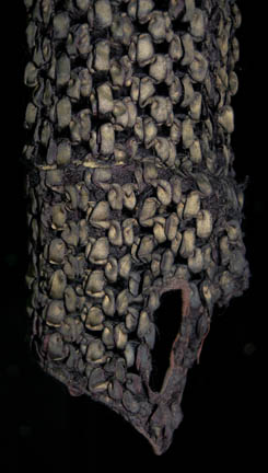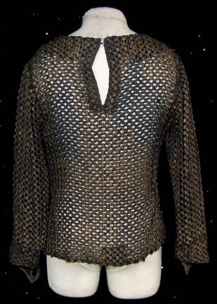 Description: A costume featured in the Star Trek: The Next Generation episode “The Vengeance factor”, wherein the “Enterprise-D” tries to settle an end to raids by a group called “The Gatherers”. This costume is for wear by Marc Lawrence in the role of the elderly Gatherer whose murder almost derail any peace talks, “Volnoth”, and is a long-sleeved, brown, crocheted ribbon shirt with holes cut into the cuffs for the thumbs and a clasp at the neck. The costumer's tag reads ‘TNG 157 Vengeance Factor, Mark Lawrence, Volnoth’.