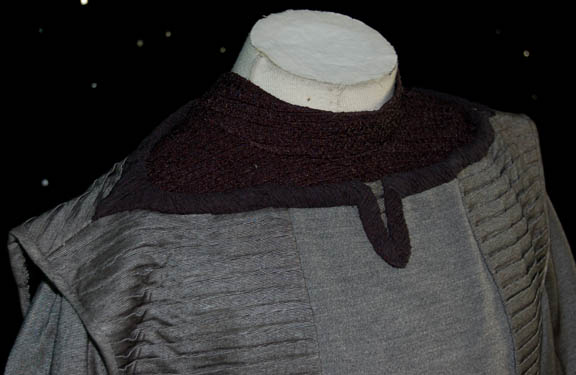 Description: A costume featured in the Star Trek: The Next Generation episode “Night Terrors”, wherein the “Enterprise-D” is ordered to find a ship that got stuck in a dangerous time/space anomaly that drains their ship of power and makes any human go insane but gets stuck in it too. This costume is for wear by John Vickey in the role of Betazoid sole survivor, “Andrus Hagen”, and is a short-sleeved, metallic gray shirt featuring long-sleeves sewn in under the short ones, a zip up the front, a black, textured dickie sewn onto the shirt, matching pleated pants, stirrups for the feet, metallic silver colored socks, and a corresponding metallic gray vest with horizontal pleats down the front and back; trim along the neck that matches the dickie and a zip and buttons down the back. A costumer's tag reads ‘#191 TNG Night Terrors, Andrus Hagen, John Vickey’.