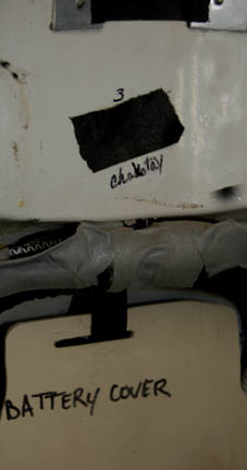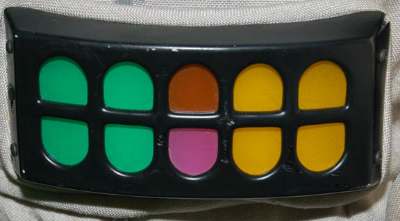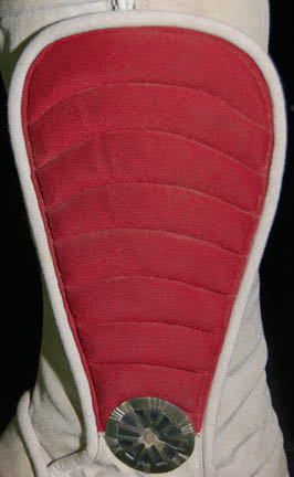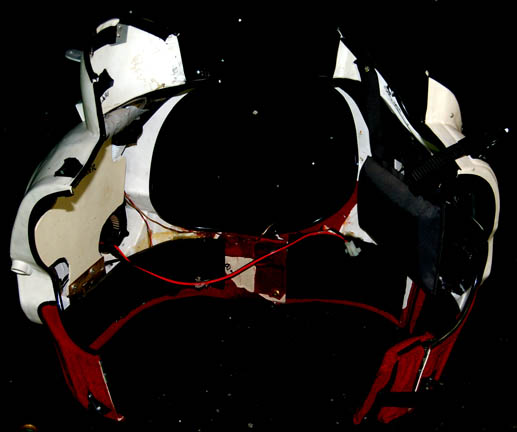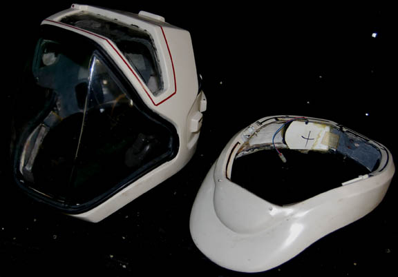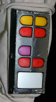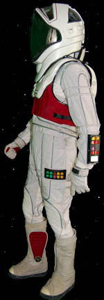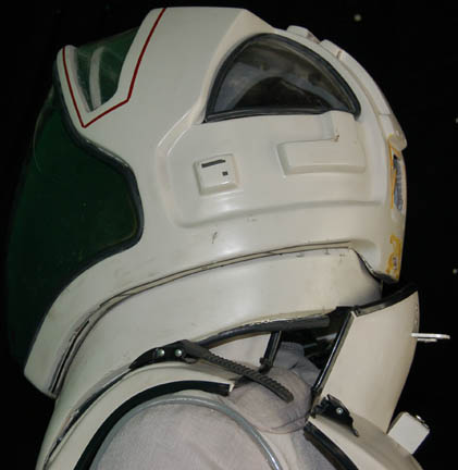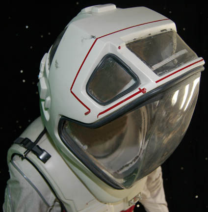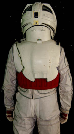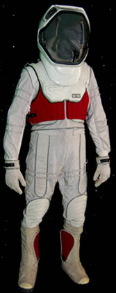 Description: A costume style first appearing in Star Trek VIII: First Contact for wear by Starfleet crewmembers engaged in extra-vehicular activities in a non-atmospheric environment, these EV suits also appeared in Star Trek: Deep Space Nine, and Voyager. The costume is a half length Spandex jumpsuit with gray tubing accents and black suspenders with a multi-colored faux button box on the left thigh, a cropped top with sleeves and a multi-colored faux button box on the left sleeve, matching boots with red flairs on the inside and metal accents on the outside ankle, matching gloves with a black snap latch, a vacuum formed chest and back piece with a red rib section and untested internal electronics made to power the button boxes, chest lights, and interior fans. The chest piece is inscribed ‘Chakotay', ‘stunt’, and ‘#3 Chakotay’, this male chest and back piece are the most complete and in the best condition of remaining male EV suit accessories. The costume also comes with a vacuum formed neck skirt for attaching the vacuum formed helmet with a clear, but cracked faceplate. The helmet features untested internal electronics and a loose gray internal element. Also included is the ‘cracked’ faceplate from the helmet of “Captain Picard” (Patrick Stewart) featured in Star Trek VIII: First Contact, a clear molded plastic piece with etched in shatter pattern. The sewn in Voyager tag in the costume top reads ‘Robert Beltran’, the half jumpsuit is inscribed ‘John’ on one side. Labels in the boots and gloves indicate wear by various actors such as ‘Gelbert Coloma’, ‘Al Goto’, and ‘Josh Clark’ who performed as ‘Lt. Carey’ in Star Trek: Voyager. This EV suit is the single best representative of remaining male First Contact style space suits.