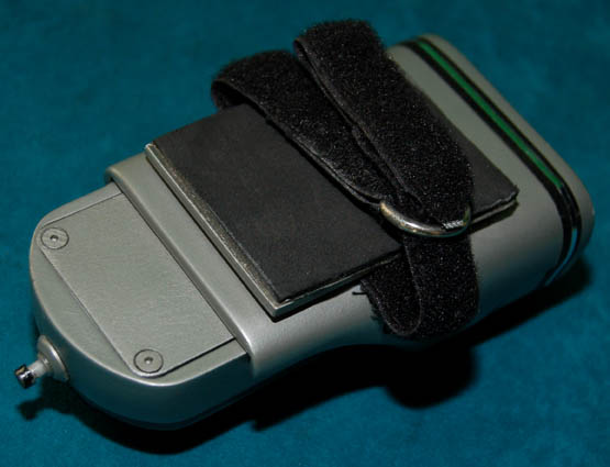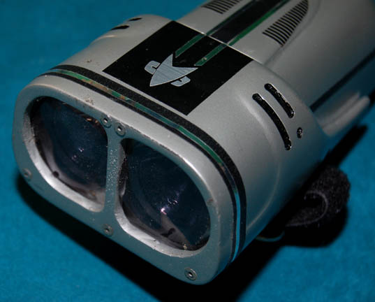 Description: A 24th century style Starfleet wrist flashlight as appeared in the Star Trek: Voyager and Deep Space Nine series as well as Star Trek VIII: First Contact. The silver colored resin case features a Starfleet logo application and an adjustable Velcro strap. There are two acrylic screens with light filter pieces applied over them. A battery and light compartment fits into the case and is secured in place with two Allen screws. There are two Surefire lights that are designed to be powered by six batteries Type 123A – 3Volt (not included) and there are more applications applied to the top for detail. A switch on the rear of unit is designed to operate the lights however the lights no longer appear to work. Measures approx. 5 ½ x 3 x 2 inches.