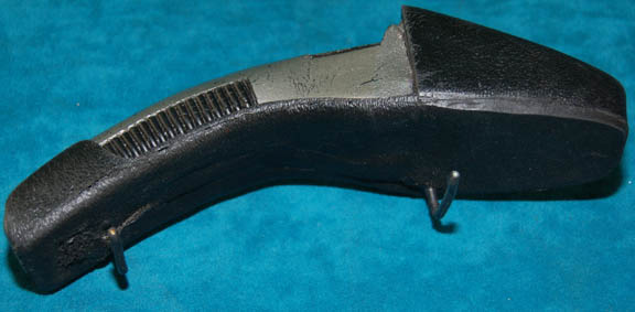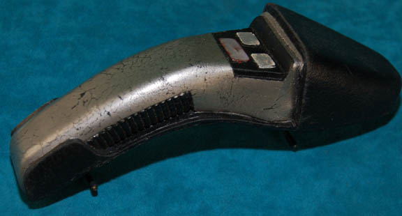 Description: A prop featured in various episodes of Star Trek: The Next Generation for use in background sequences where the phaser doesn't have to be removed from the holster. This item is a silver molded foam rubber phaser in a black holster with silver button and black hand grip accents, hooks to hang on a belt or waistband, and minor cracking due to time and storage. The item measures approx. 8 X 2 X 2.5 inches.