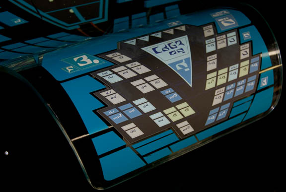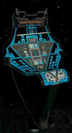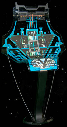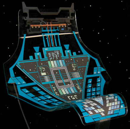 Description: A prop computer console featured in multiple episodes of Star Trek: Enterprise beginning with the pilot episode “Broken Bow” where it was a Suliban console, then later in the episodes “Babel One”, “United”, and “The Aenar” where they were altered to appear as Romulan computer consoles. The item is a freestanding formed clear acrylic panel on a wood base with metal braces with screw holes for mounting onto a larger base. The item features multiple faux rubber gel buttons, a large Romulan style ‘display screen' graphic on both the front and reverse, with teal application details and Romulan iconography accents across the whole front. A lighting feature is present on the reverse which is connected to leads present on the underside of the main computer interface. The item measures approx. 60 X 29 X 25 inches.