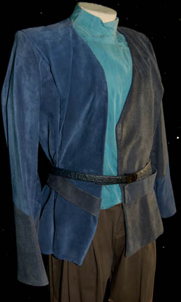 Description: A costume featured in the Star Trek: Deep Space Nine episode “The Siege”, wherein “Commander Sisko” (Avery Brooks) tries to keep an extremist faction of Bajorans known as “The Circle” from taking over the station and “Major Kira” (Nana Visitor) and “Lieutenant Dax” (Terry Farrell) race back to prove to the Bajoran government that the Cardassians are supplying them. This costume is for wear by Alexander Siddig in the role of the genetically enhanced Chief Medical Officer of Deep Space Nine, “Dr. Julian Bashir”, and is a long-sleeved, light-blue, silk shirt with a wrinkled print, olive-colored trousers, brown suede reinforcements halfway down the leg, stirrups for the feet; a long-sleeved, blue, leather/suede jacket, with a faux-scale pattern, and smooth blue suede around the cuff on one half, the opposite design on the other half, a belt around the middle, and a zip down the front. A sewn in tag reads ‘Deep Space Nine, Mr. S. El Fadil' and the costumer’s tag reads ‘DS9 423 The Siege, Bashir, Siddig El Fadil.