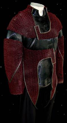 Description: A costume featured in the Star Trek: Deep Space Nine episode “Whispers, wherein “Chief O'Brien” (Colm Meaney) is kidnapped and replaced by a replicant who was going to assassinate the leaders of a rebel faction when they showed for peace talks. The costume is for wear by Bill Hagy in the role of one of the Paradan bodyguards to the Ambassador and is a half length, long-sleeved jumpsuit with a dark violet smocked velvet design, ribbed vinyl insets along the chest, waist, and arms on both sides; silver-black piping, several Velcro closures, neoprene lining; black, overall style trousers, and stirrups for the feet. The costume has minor distress due to time and storage, a sewn in tag that reads ‘Deep Space Nine, Bill Hagy, and a costumer’s tag that reads ‘434 DS9 Whispers, Bodyguard, Bill Hagy’.