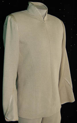 Description: A costume featured in the star Trek: Enterprise episode “Stigma” for wear by a Vulcan Technician (Louis Ortiz). The costume is cream colored trousers and a matching zip front jacket, both with stylized ankles and cuffs with satin trim, and a pair of cream colored leather slip-on shoes. The sewn in Enterprise tags read ‘Louis Ortiz 040' and the costumer’s tag reads ‘Enterprise #040 Stigma, Vulcan Technician, Louis Ortiz’ and lists the components. Louis Ortiz is a veteran Star Trek actor who also appeared in various Star Trek: Voyager episodes, Star Trek VI: The Undiscovered Country, and multiple Star Trek: Enterprise episodes.