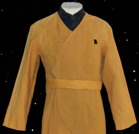 Description: This is a fabulous gold engineering jumpsuit from the beloved Star Trek: The Next Generation series featuring “Captain Picard” (Patrick Stewart). The jumpsuit is moderate weight mustard yellow fabric with a cross over chest and a zip at the front. A matching belt and a black sleeveless undershirt also accompany the suit. Costume comes complete with costume tag.