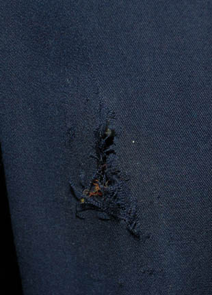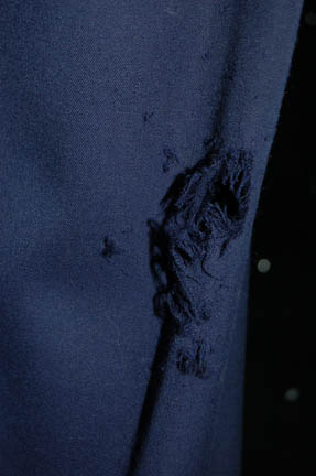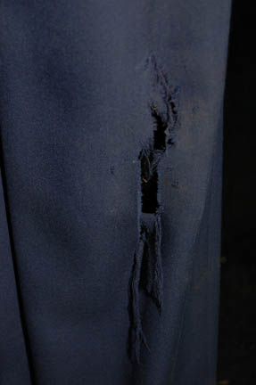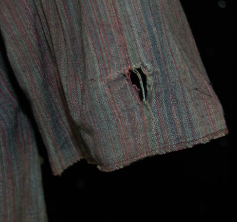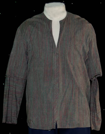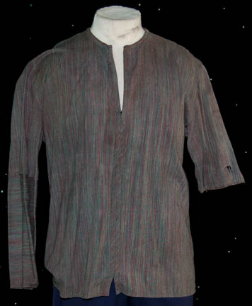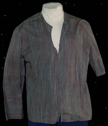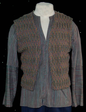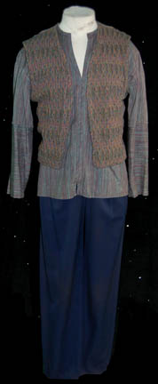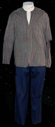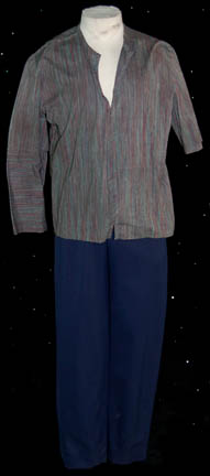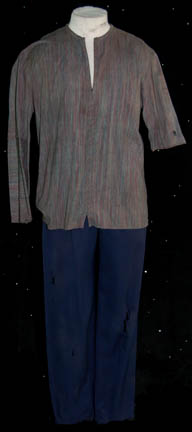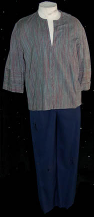 Description: A costume lot for wear by “Harry Kim” (Garrett Wang) in the Star Trek: Voyager episode, “The Chute” in which Kim and “Tom Paris” (Robert McNeill) were found guilty of bombing an Akritarian canteen. The lot includes five purple stripes shirts with slightly different sleeve variations, five pairs of blue trousers of which three pairs are distressed with holes and a single multicolored knitted vest. Two shirts, two pairs of trousers (one distressed) and the vest have sewn in tags that read “Voyager – Garrett Wang” and the remaining shirts and trousers have other actors' names in them. They were presumably Wang’s stunt doubles. The accompanying costume tag reads “Voyager – 147, The Chute, Kim, Garrett Wang, 5 shirt, 1 vest, 5 pant”.