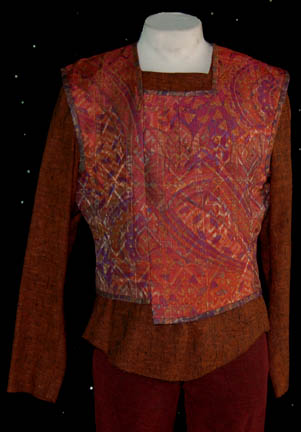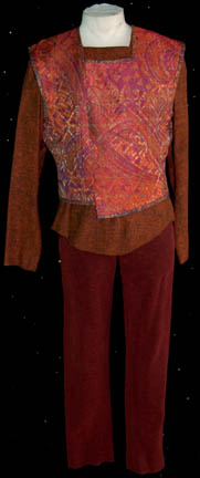Description: A costume featured in the Star Trek: Deep Space Nine, wherein “Captain Sisko” (Avery Brooks) plans to marry “Kasidy Yates” (Penny Johnson), “Commander Worf” (Michael Dorn) is missing after a battle with Dominion forces and “Gul Dukat” (Mark Alaimo) gets facial alterations to appear Bajoran. This costume is for wear by Mark Alaimo in the role of one of the most complex and developed villains in Star Trek history, “Gul Dukat”, and is a short-sleeved white undershirt with pads sewn into the shoulders and chest, a rust and black specked long-sleeved tunic, a zip up the back, a brightly multicolored vest in various shapes, maroon, textured, criss-cross patterned trousers, stirrups in the feet, and a long-sleeved, gray jacket featuring a unique, abstractly curving design. Also included in this lot are an extra vest and tunic but the tunic was never actually used. A sewn in tag reads ‘Deep Space Nine, Mark Alaimo 3, Card.' and the costumer’s tag reads ‘DS9 #567-749, Dukat, Mark Alaimo, #3’.