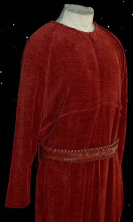 Description: A costume featured in the Star Trek: The Next Generation episode “Chrysalis”, wherein “Dr. Bashir's” (Alexander Siddig) enigmatic band of genetically enhanced friends returns to DS9 in the hopes that the Dr. can correct the catalepsy that resulted from “Sarina’s” (Faith C. Salie) enhancements. This costume is for wear by Michael Keenan in the role of one of the genetically enhanced humans whose personality is stuck in a child-like state, “Patrick”, and is a long-sleeved, full-length red, chenille jumpsuit with textured stripes, belt loops for an included red, braided leather belt, a zip up the front, and matching socks. A sewn in tag reads Deep Space Nine: Michael Keenan’ and the costumer’s tag reads ‘DS9 #555, Patrick, Michael Keenan.’